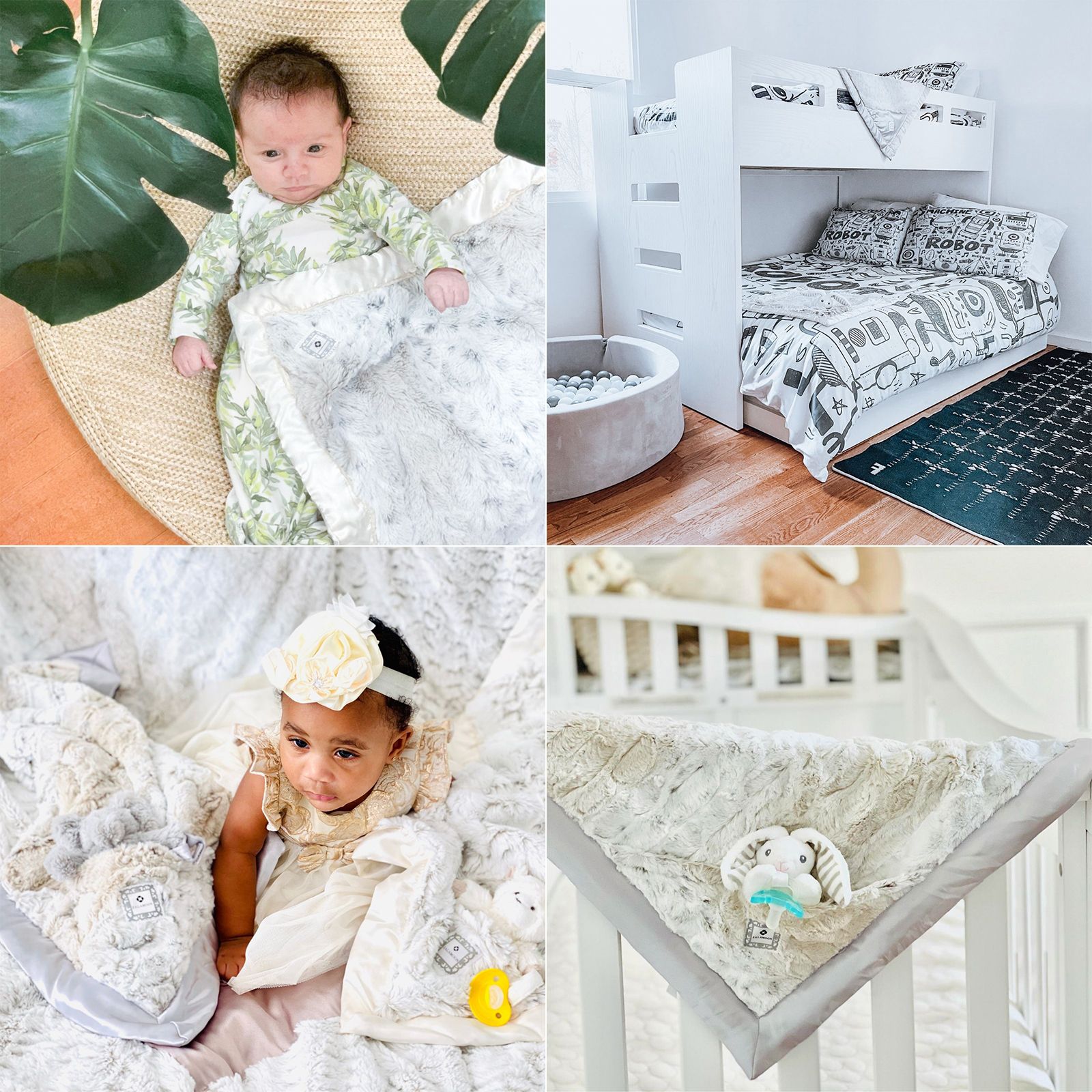 Our patented couture security blanket includes a pocket and velcro fastener to attach or store your child’s favorite toy, teether or snack. This soft and cozy blanket features satin trim for self-soothing and is the perfect baby shower gift.