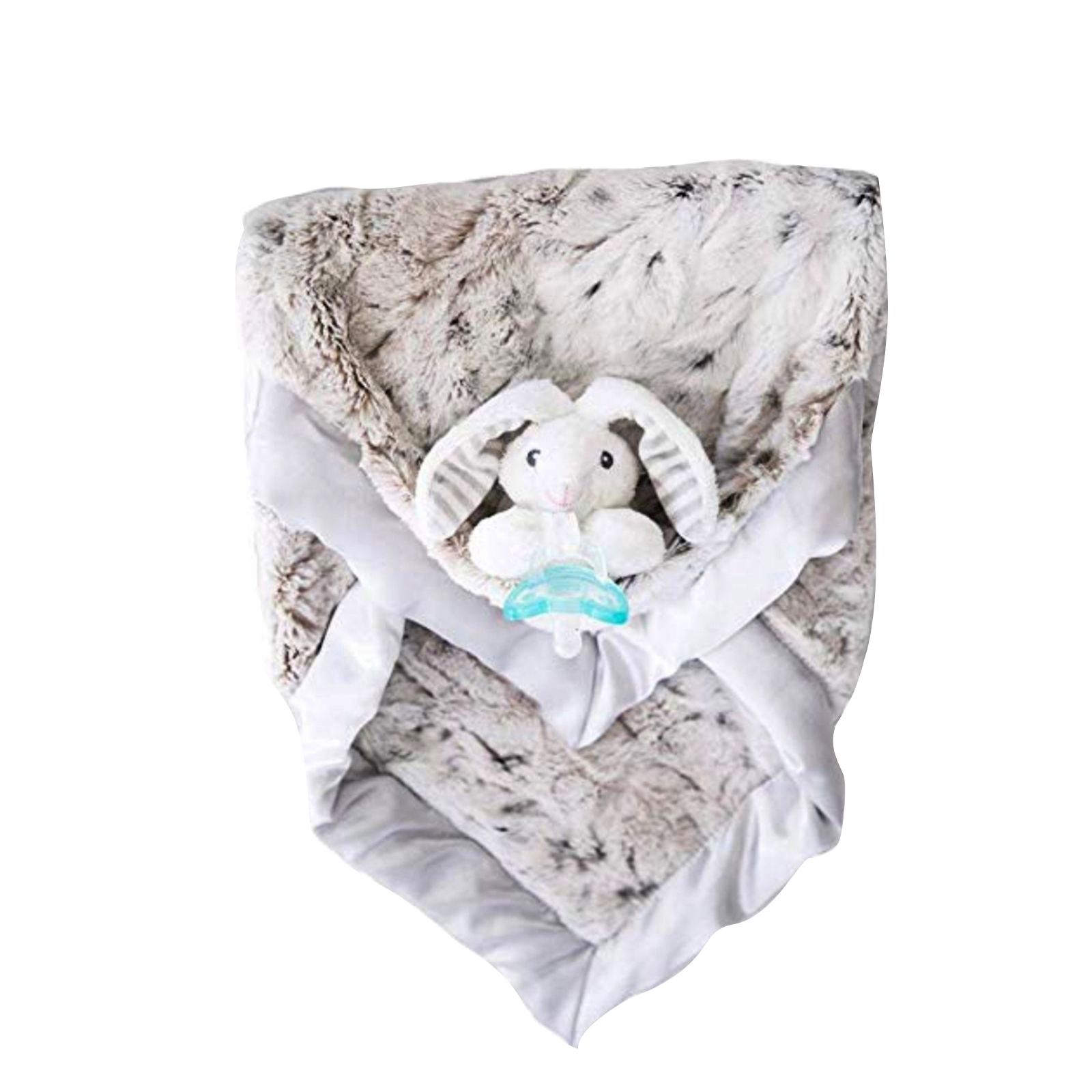 Zalamoon Luxie Pocket Blanket in Snow Leopard with Coco Bunny RaZbuddy and JollyPop pacifier