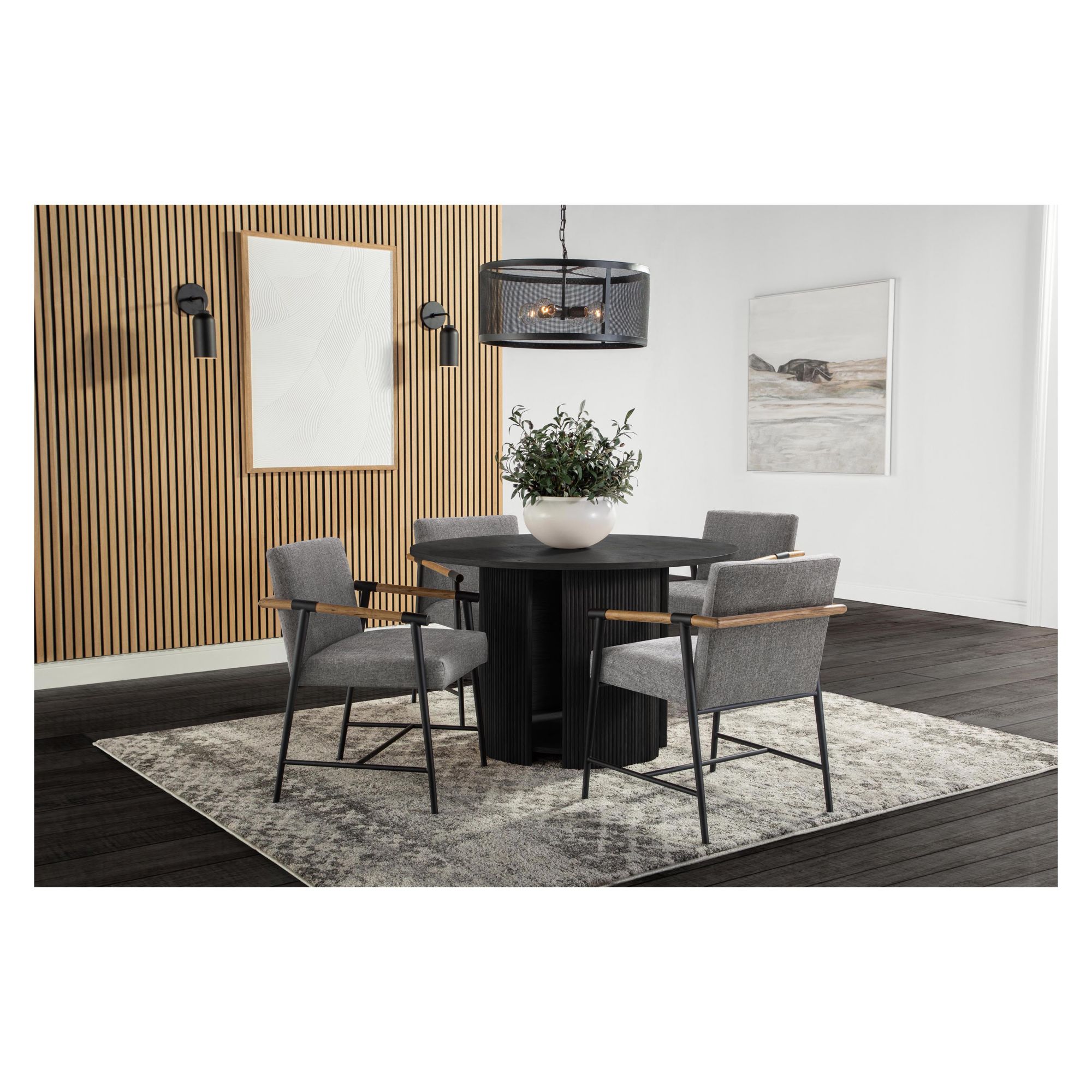Dining table is made of solid hardwood with an Oak veneer The kiln-dried hardwood frame is to help prevent against warping Chair fabric is stain proofed with a soil, oil, water repellent finish The fabric is a micro-denier chenille, linen look that brings any piece of furniture to life with its soft, full hand and rich, opulent colors Assembly required Includes (1) dining table and (4) dining chairs