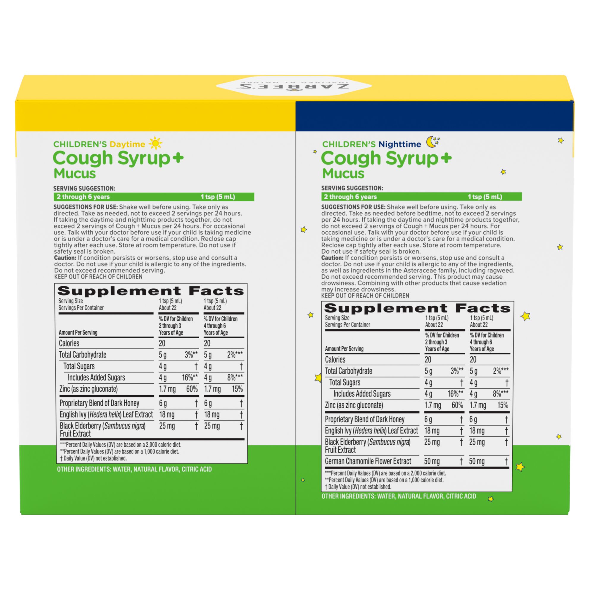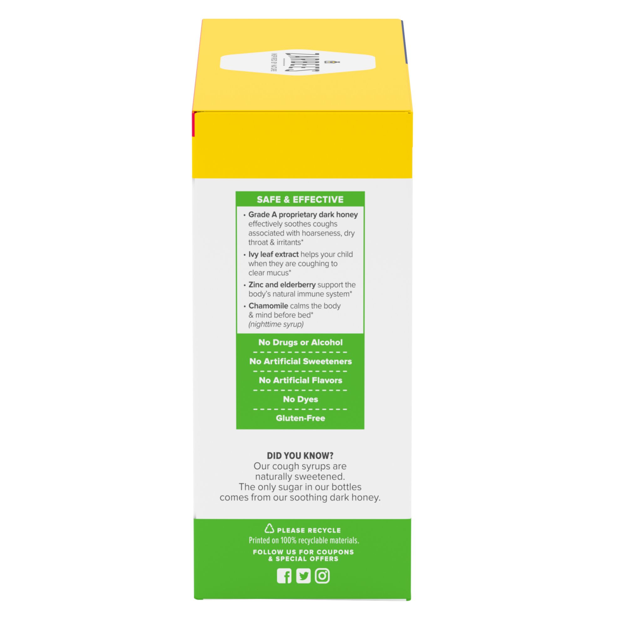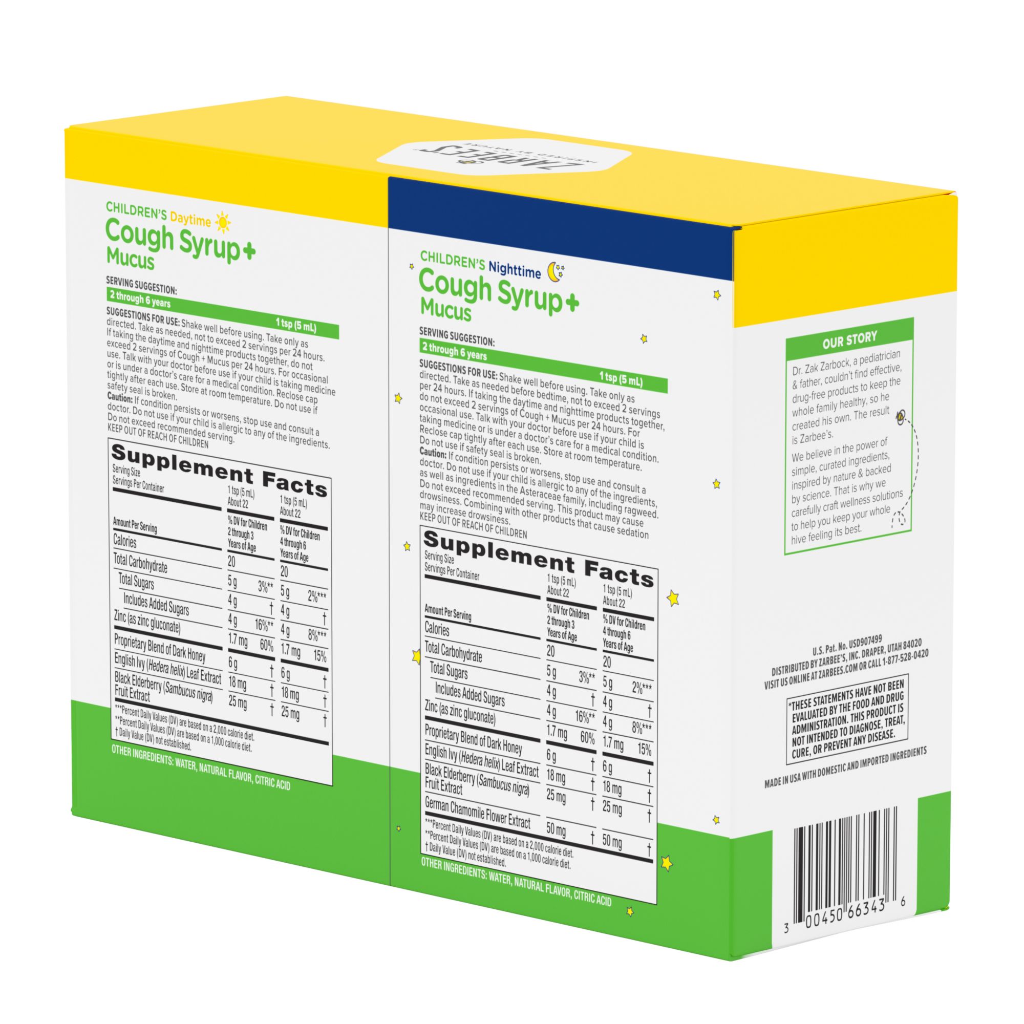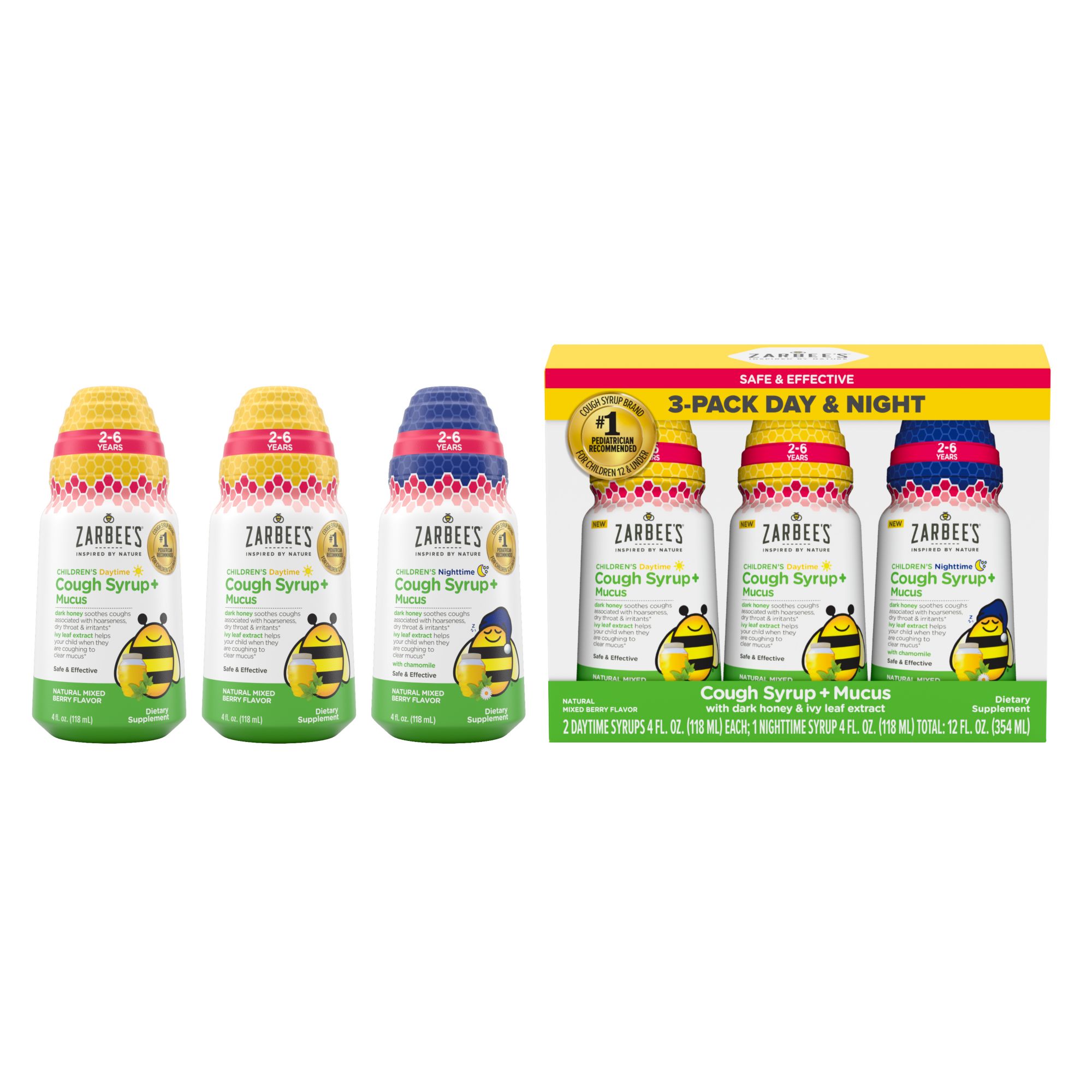 2, 4 oz. bottles of daytime cough + mucus syrup, 1, 4 oz. bottle of nighttime cough + mucus syrup Carefully tailored for kids 2-6: Soothes coughs*, helps clear mucus, & supports the immune system Ingredients inspired by nature & backed by science – honey, ivy leaf, Zinc, elderberry, chamomile Naturally sweetened, mixed berry flavor. The only sugar in the bottle comes from soothing dark honey Free of drugs, alcohol & added flavors, or dyes. Allergen-friendly: gluten, dairy, egg, peanut free #1 pediatrician recommended cough syrup brand for kids 12 and under Soothes coughs associated with hoarseness, dry throat and irritants