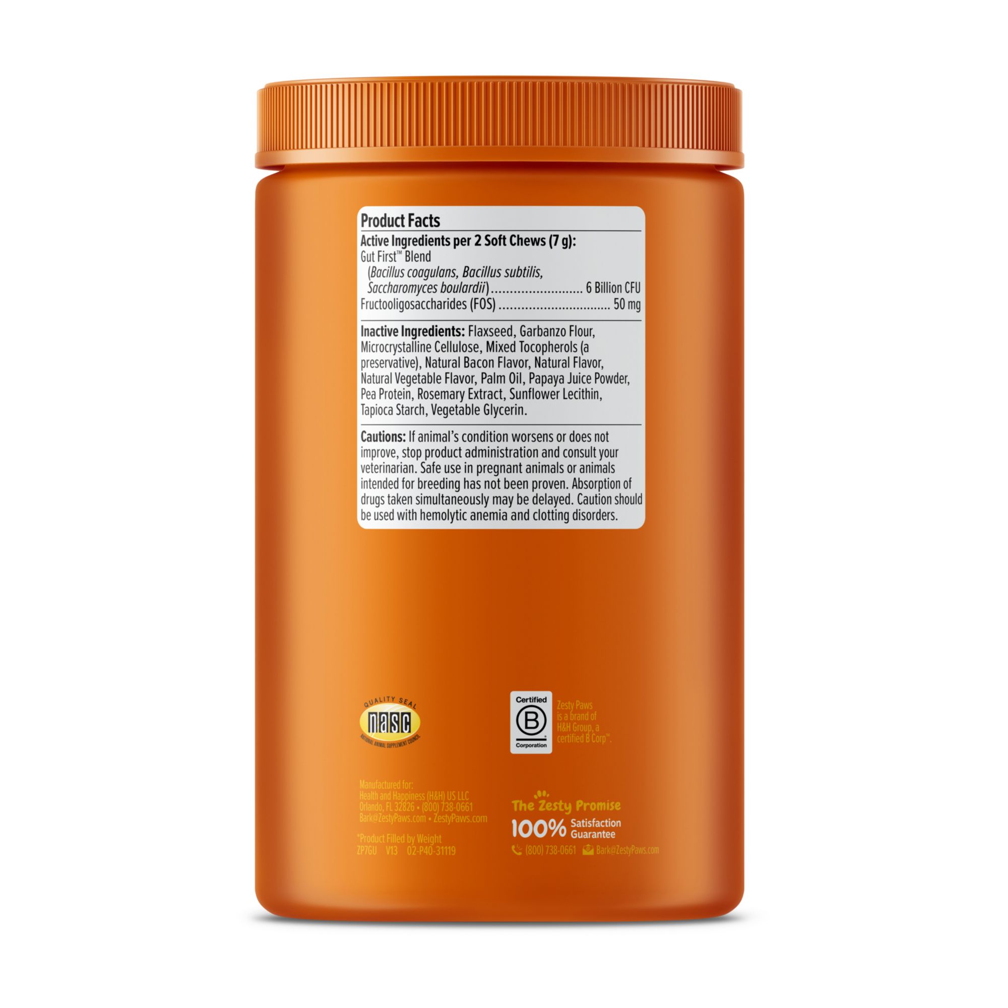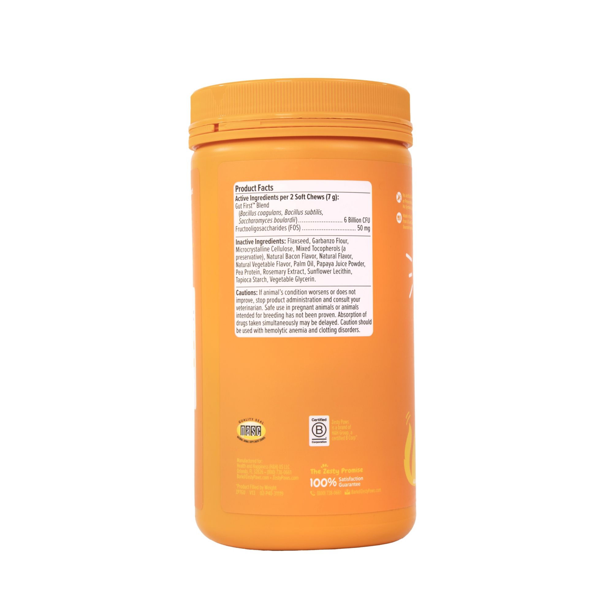 Ingredients: Gut First™ Blend (Bacillus coagulans, Bacillus subtilis, Saccharomyces boulardi), Fructooligosaccharides (FOS), Bacon, Flaxseed, Garbanzo Flour, Microcrystalline Cellulose, Mixed Tocopherols (a preservative), Natural Flavor, Natural Vegetable Flavor, Palm Oil, Papaya Juice, Pea Protein, Rosemary Extract, Sunflower Lecithin, Tapioca Starch, Vegetable Glycerin.