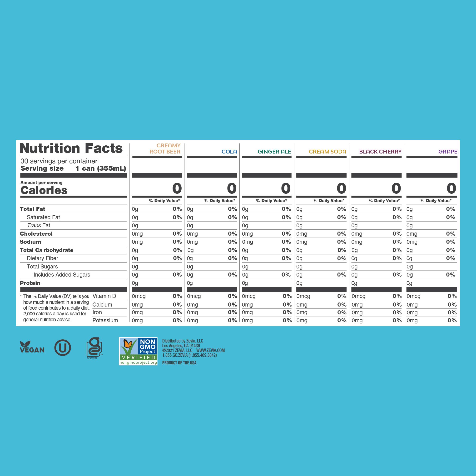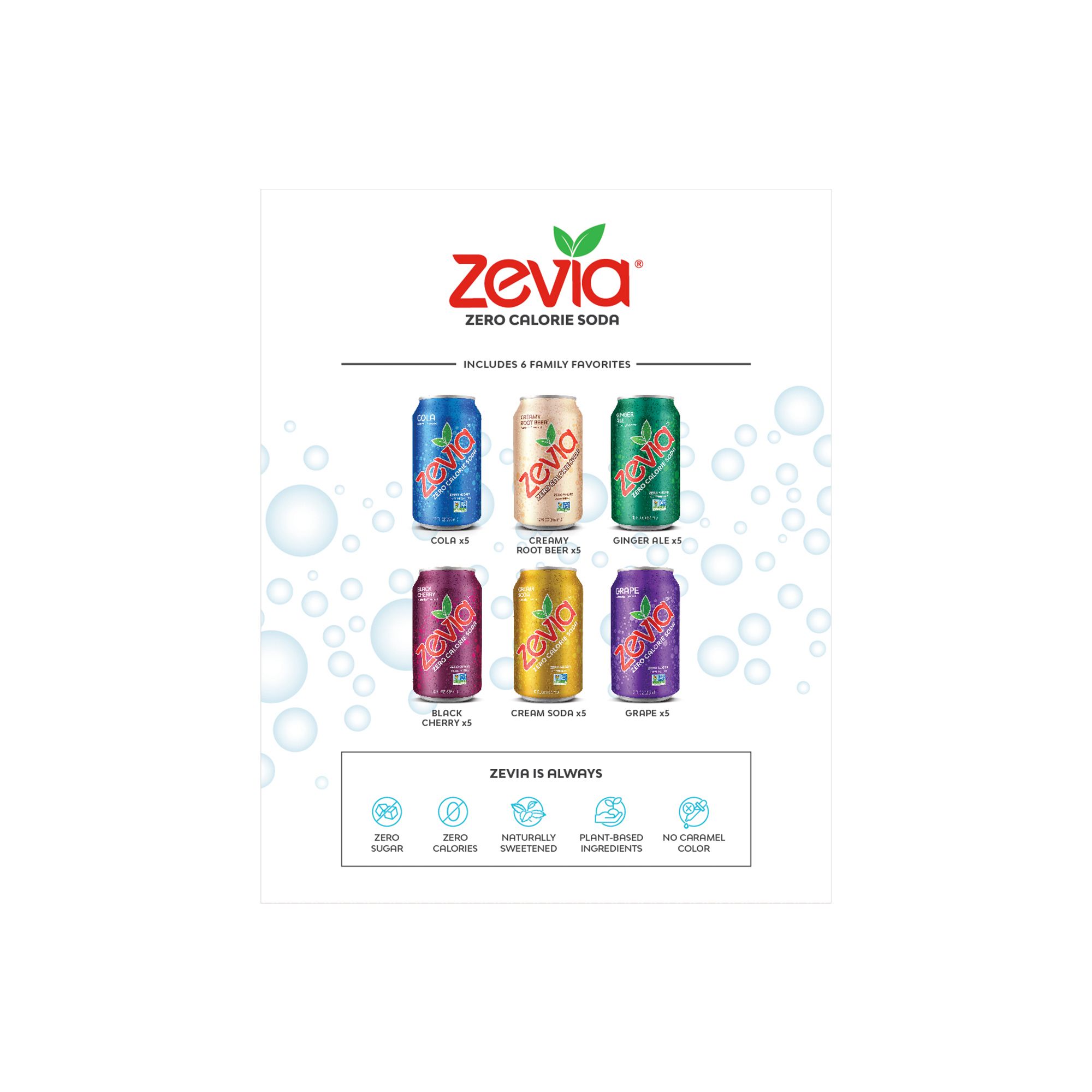 At Zevia, every beverage is made with zero sugar, zero calories, and simple, plant-based ingredients so you can have all the sweetness and flavor you crave. Never any caramel color. Vegan and non-GMO project verified. Club 30 pk. includes five cans each of Cola, Creamy Root Beer, Ginger Ale, Black Cherry, Cream Soda, and Grape.