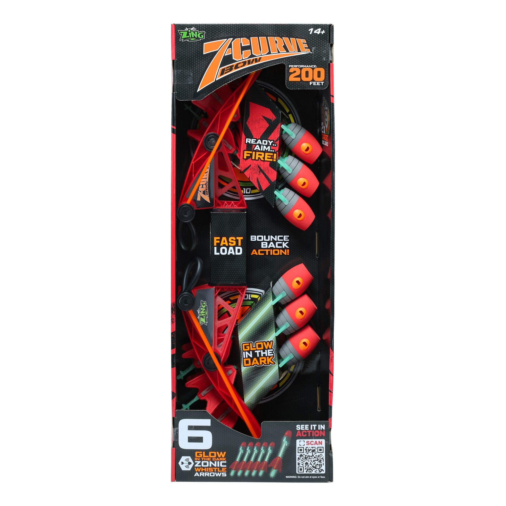 Includes one Z-Curve bow with 6 glow in the dark long range whistling arrows