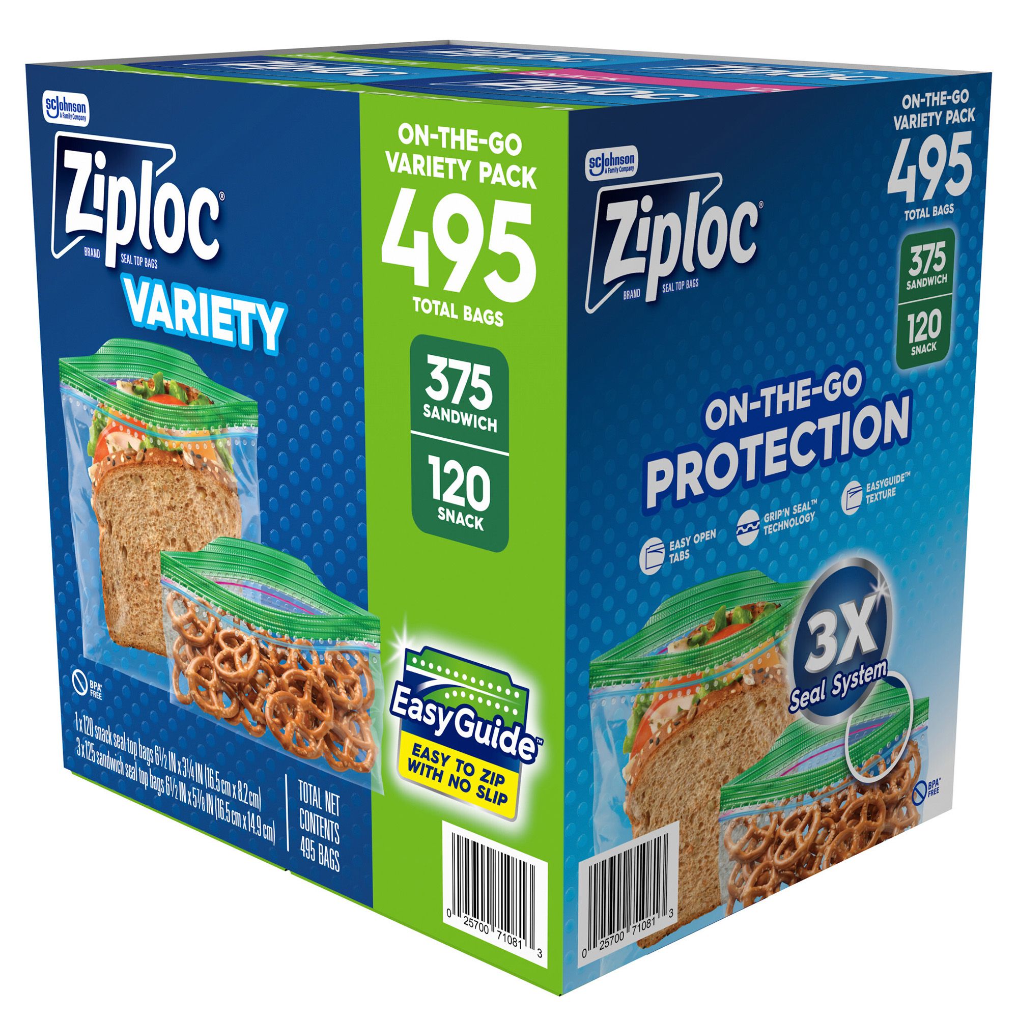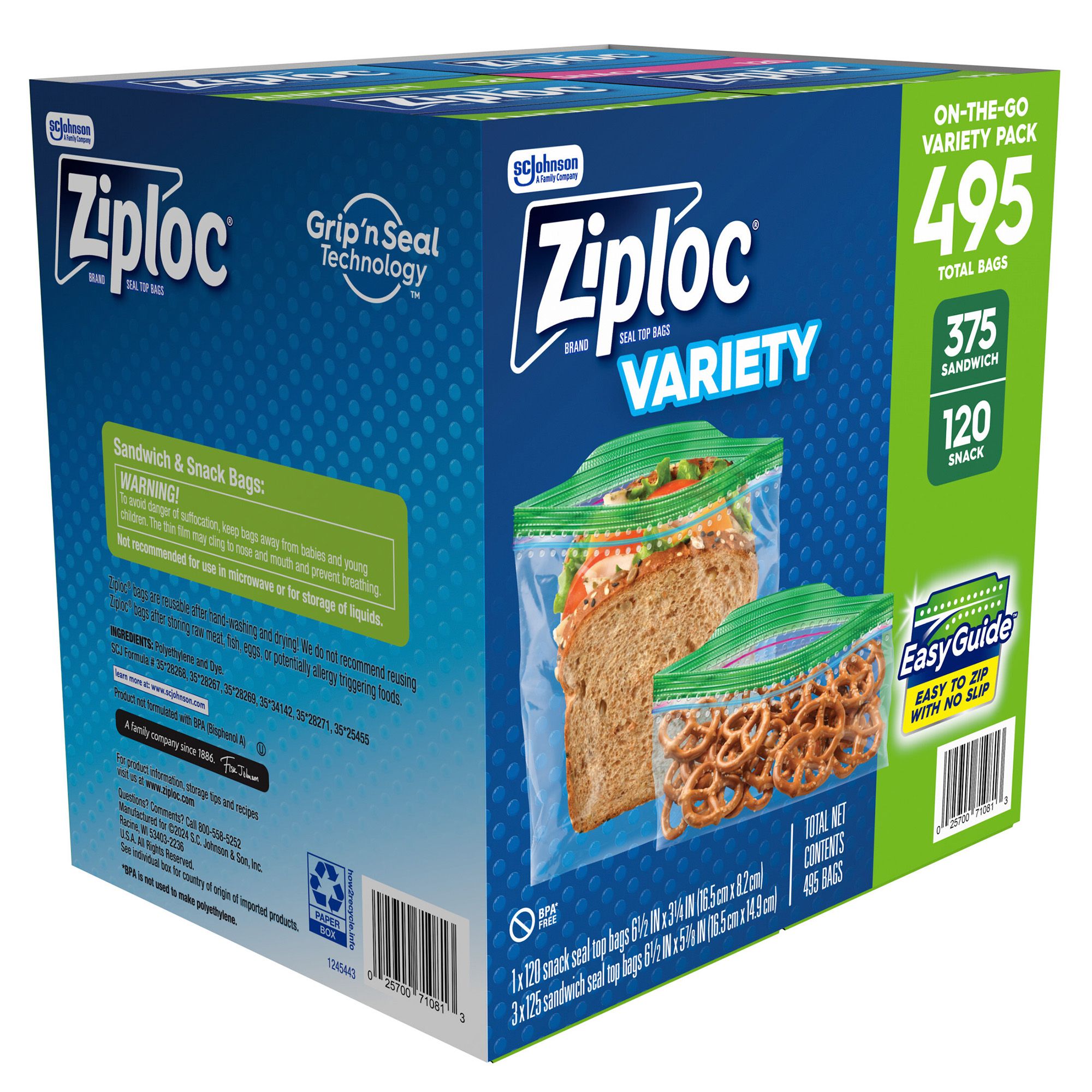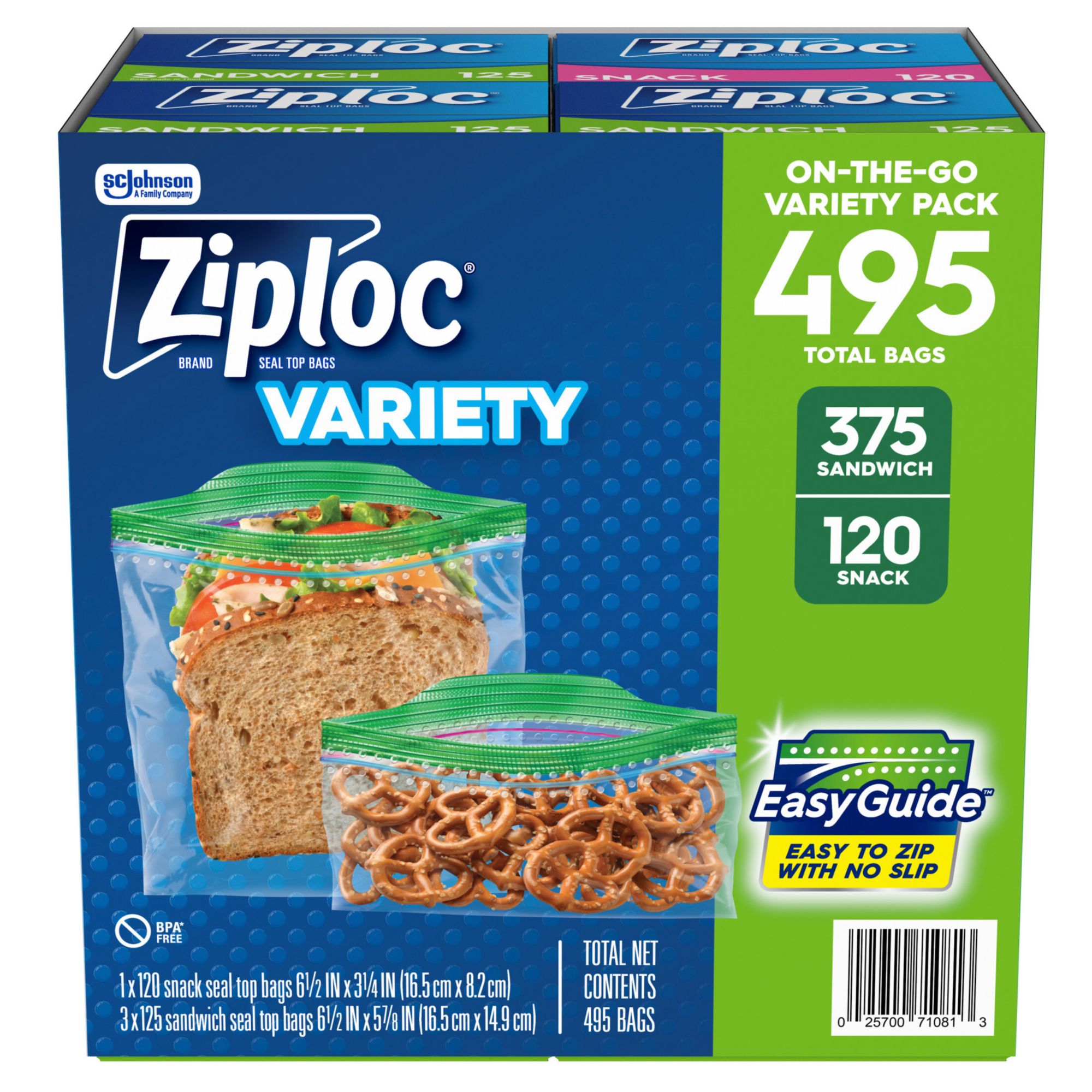 Also try Ziploc® bags in freezer, storage and compostable types Includes on-the-go variety pack, 375 sandwich and 120 snack sized plastic bags