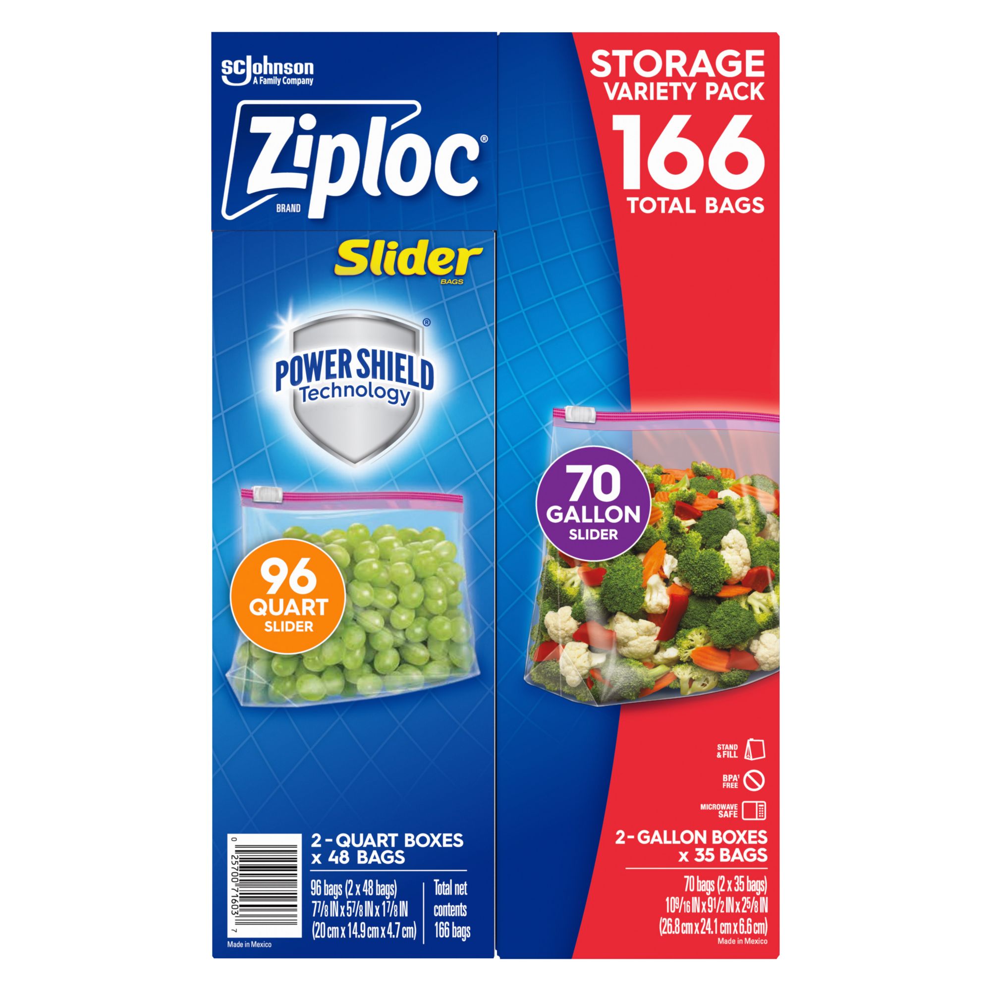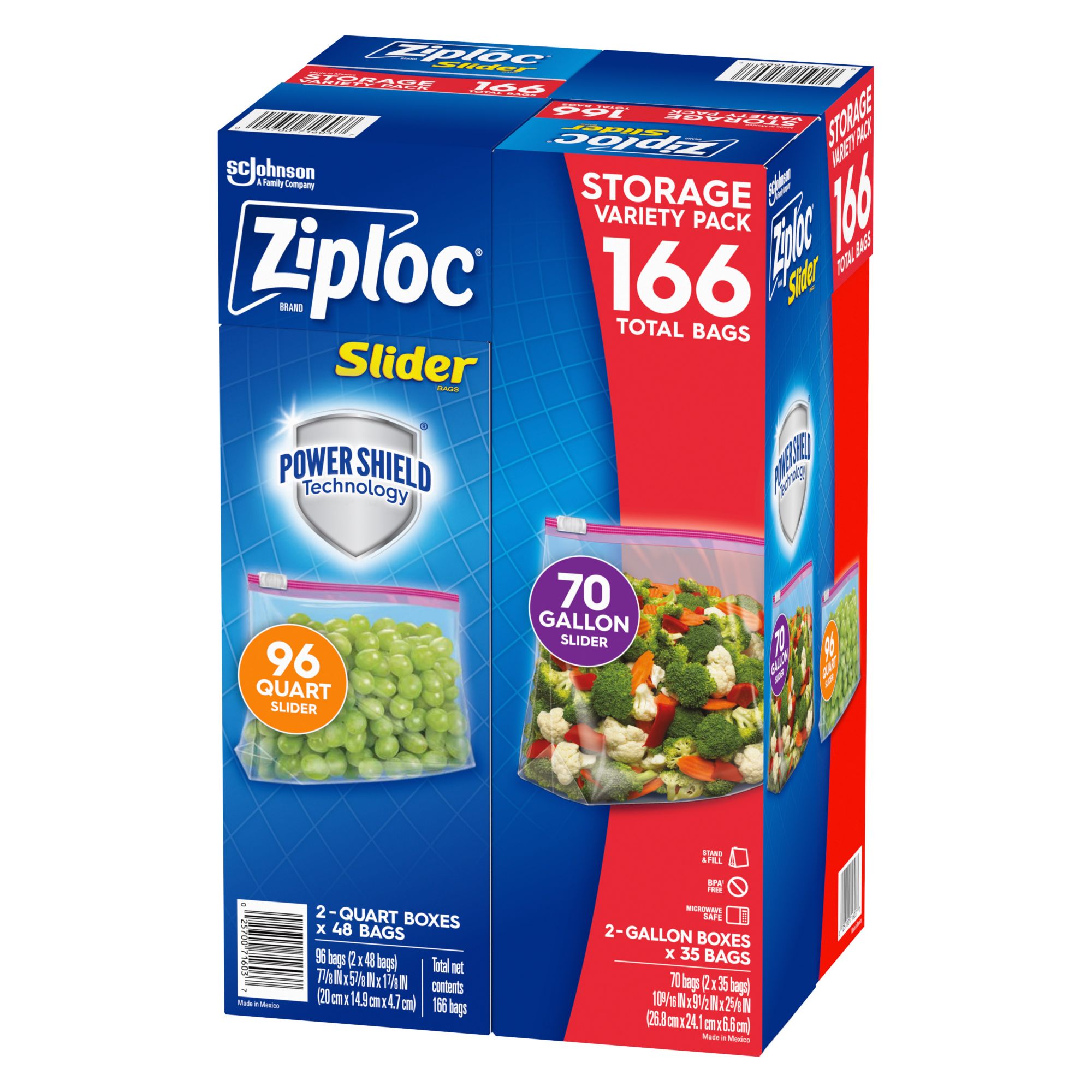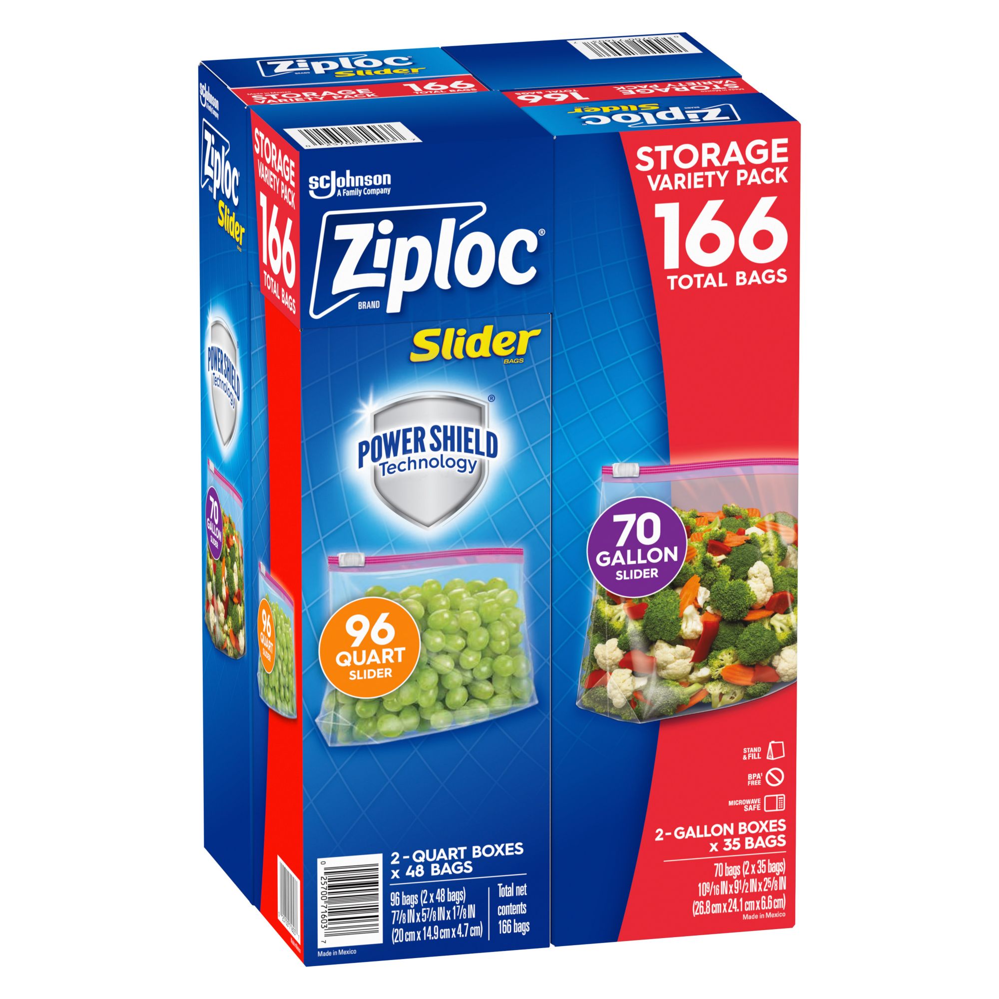 Meet the Ziploc Slider Storage Bags, a must-have for every household. This variety pack includes 166 storage bags in two sizes: Quart (96 ct.) and Gallon (70 ct.), catering to all your storage needs. These bags are designed with a smart zip and an expandable bottom, ensuring easy usage and ample storage space. Made from durable plastic, these bags are perfect for storing food, organizing items, or even for travel purposes. The Ziploc Slider Storage Bags are microwaveable, adding to their versatility. Experience the convenience and reliability of Ziploc, a trusted name in household products.