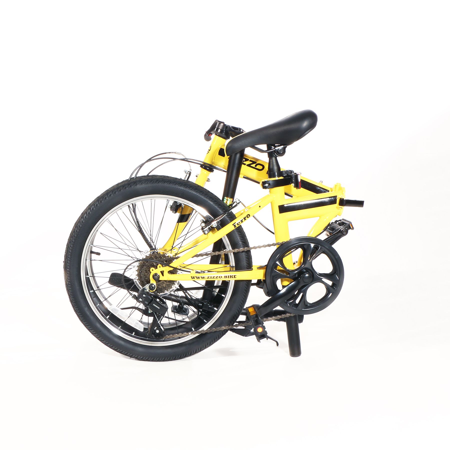 The Zizzo Ferro 20" High Tensile Steel Frame, 7-Speed Folding Bicycle, 20"L x 1.95"W all-terrain tires features adjustable height alloy handlebar post, and alloy seat post to accommodate most riders from 4'10" to 6'3". Zizzo bikes use industry-standard components. This bike comes in white.